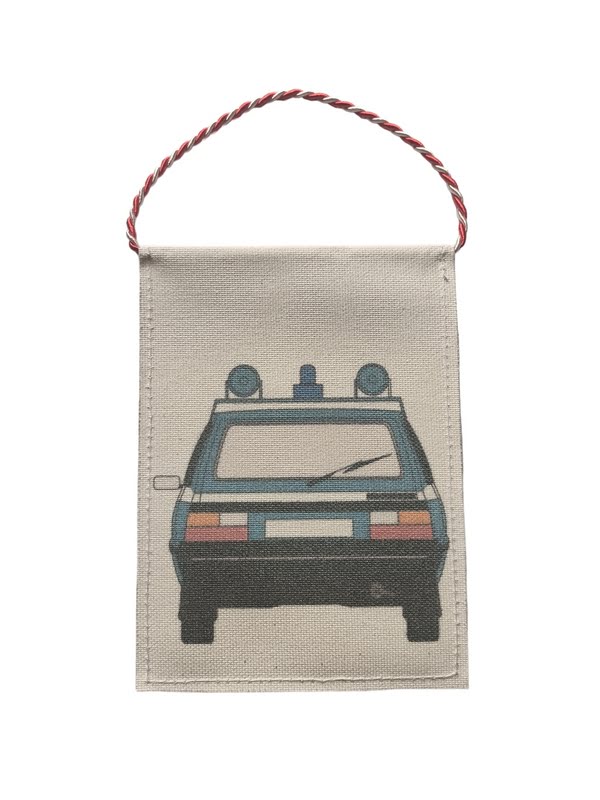 Proporczyk z prawdziwym klasykiem tamtych lat czyli Polonezem w wersji Milicyjnej